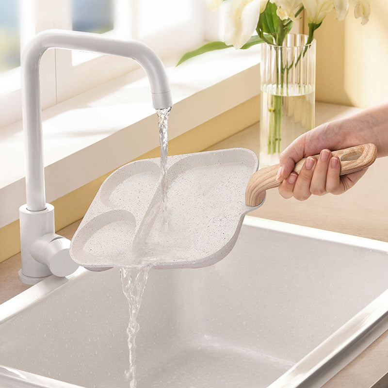 This frying pan is divided into three cooking zones, allowing you to fry multiple ingredients simultaneously, such as round fried eggs, hamburgers, fried meat, shrimp, and bacon. The triple-layer composite pot bottom ensures more uniform heating.